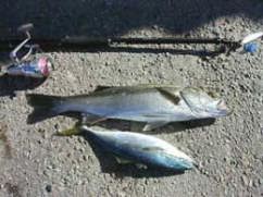すかさず2投、3投・・・ヒット−!スピ−ド感あふれる青物の引きで、ヒラマサッ子ゲット−!!!40p位だ。その後チェイスしてくるがフッキングには至らない。これから夕マズメで爆釣間違いなしなのに、もう行かなければ・・・後ろ髪を引かれながら終了!