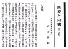 Sさんは2週間に1回の診察に現れる。彼女との付き合いは、富山市民病院に勤務した時から二十年近くになる。私も彼女も年はとったものの、彼女の訴えには磨きがかかっている。この2週間の出来事、下痢や腹痛、倦怠感に悩まされ救急外来に来て治療を受けた事や、何か大変な病気でないかなどの不安を、二十数分かけて鬼気迫る表情で一気呵成に語る。いや、恍惚?とも見える。途中に話しを止めるような質問でもすると、彼女の訴えは始めに戻ってしまう。聞き手の私にとっては一瞬有り難い?お経を聞かされている気分になる。私は最も有力なコミュニケーションの手段と言われる「傾聴」の難しさを感じ、医師としての修練の未熟さを思い知らされる時ともなる。