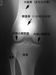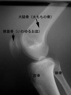 内側や外側の関節面はレントゲンでは透き間が空いているように写ります。この間には軟骨がありますが、軟骨はレントゲンには写りません。 右膝の関節の側面から見たレントゲン写真です。