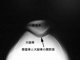右膝の関節を曲げた状態でお皿(膝蓋骨)と大腿骨の関節面を見たレントゲン写真です。