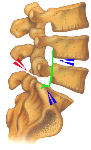 緑の線でなぞってあるように、上の青矢印のところでは腰椎はずれていませんが、下の青矢印のところでは腰椎がずれていることがわかります。