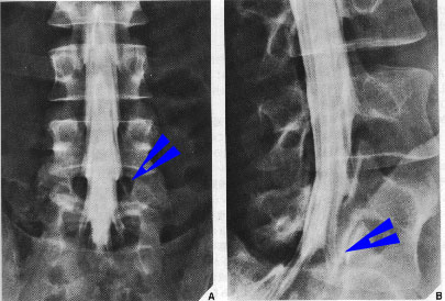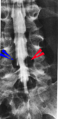 左の図は椎間板ヘルニアの方の脊髄腔造影を正面から見たものです。