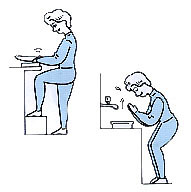 [右の図]台所のような一カ所にしばらく立っているときは、15センチほどの足台を用意してどちらの足でも良いですから乗せておいて下さい。この姿勢によって腰への負担が少なくなります。