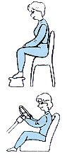 [左の図]椅子に座るときは、やはり足台を持ってきて足を乗せて下さい。つまり足の付け根より膝の方が高くなるようにして下さい。この姿勢で腰への負担が少なくなります。足を組んでも同じ効果が得られます。(この場合どちらの足でもかまいません)