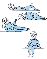 [右の図]寝ている状態から体を起こすときは、まず膝と股関節(足の付け根)を曲げて横向きになります。