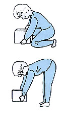 [左の図]物を持ち上げるときは、左の上のように腰を下ろしてから行って下さい。