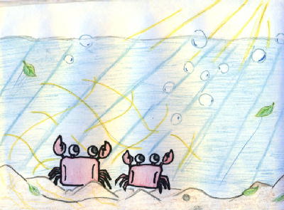 波から来る光のあみが、底の白い岩の上で、美しくゆらゆらのびたり縮んだりしました。あわや小さなごみからは、まっすぐなかげの棒が、ななめに水の中に並んで立ちました。