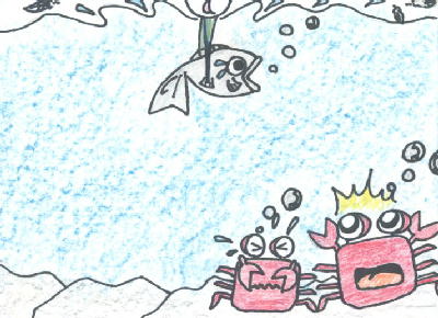 魚が苦しんでいるようになみだをつけた。波を工夫したし、羽もとばした。