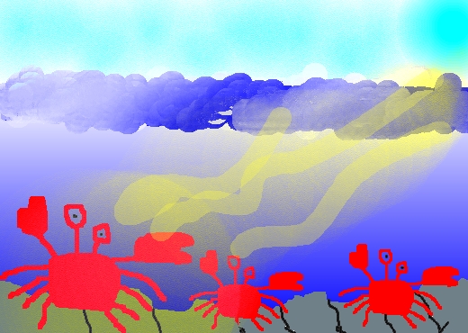 にわかにぱっと明るくなり、日光の黄金は、夢のように水の中に降ってきました。 波から来る光のあみが、底の白い岩の上で、美しくゆらゆらのびたり縮んだりしました。あわや小さなごみからは、まっすぐなかげの棒が、ななめに水の中に並んで立ちました。