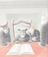 これがその絵です。窯猫がカゼで休んでいるときに、他の猫達が、「何も今度は、俺が事務長になるとかいっとるそうだ。」