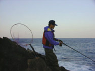 そのうちにミノ−にフクラギがヒット!う〜ん、これはフクラギ狙いだな。メタルジグに変えて引きまくるがヒットしない。ミノ−に変えると、足下でヒット!よく見ると、足下でベイトが追われている。そのまま近距離で2本追加したところで、暗くなってきたので危険なので撤収!