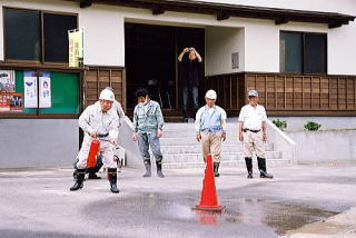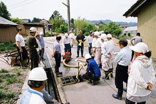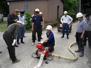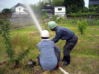 説明後会館横の水路を利用して放水訓練、及び水消火器を使用した消火