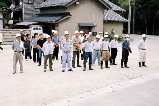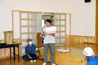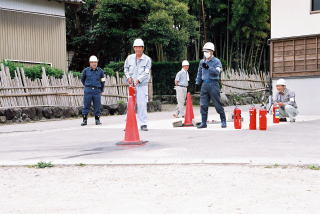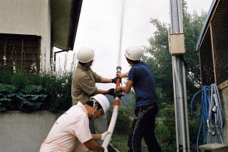 4 内 容 会館横の水路を利用して小型動力ポンプの放水訓練、水消火器を使用した消火
