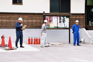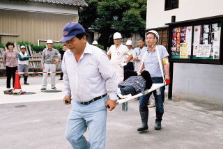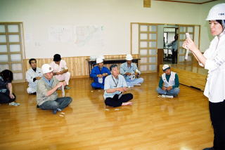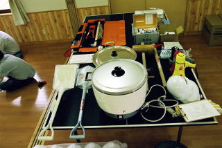 訓練、簡易担架による搬送訓練、新聞紙を使った防災スリッパ作成、非常食の試