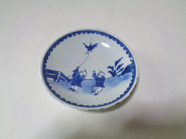 | 古染唐子凧揚紋皿 明時代 径14.8 高3.4 無傷 箱無 面白い図柄が有るものです 価格 ¥120.000 |