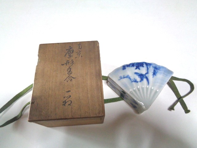 | 染付扇面香合 清朝末期 幅8.8 高3.6 合口に小ホツ有り 価格 ¥45.000 |