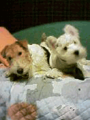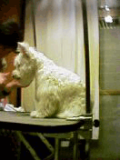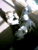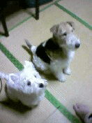2002.12.18 パパにシャンプーして、きれいきれいしてもらった。 その後ママががーがー乾かしてくれたんだけど、おっかない高い台の上でやるんだ。ぼく、こわいからじーっとしてたんだよ。 ジップお兄ちゃんはそんなぼくをからかって、台に手をかけてちょっかいを出すんだ。 |