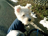 2003.1.8 はじめてのおさんぽ!ちゅうちゃをお正月にうってもらったから、もうお外もだいじょうぶ。 おうちの廻りは雪でいっぱい! きもちいいよ!たのしいよ!お外はおもしろいねっ! |