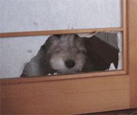 今日、紙の戸にちっちゃな穴が空いてるのを発見。鼻をつっこんでみたら、どんどん大きな穴になっちゃった。べりべりってやぶいてみたら、中がよーく見えたよ。頭入れて入ろうとしたけど、それは無理だった。ママは大笑いしちゃって怒れなかったんだ。ラッキー! |