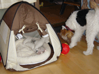 我が家で13週目 | ママの友達が、ママの誕生日にぼく用のテントを送ってくれた。かっこいいんだけど、お家の中でこれに入ってみろって言われても・・・。